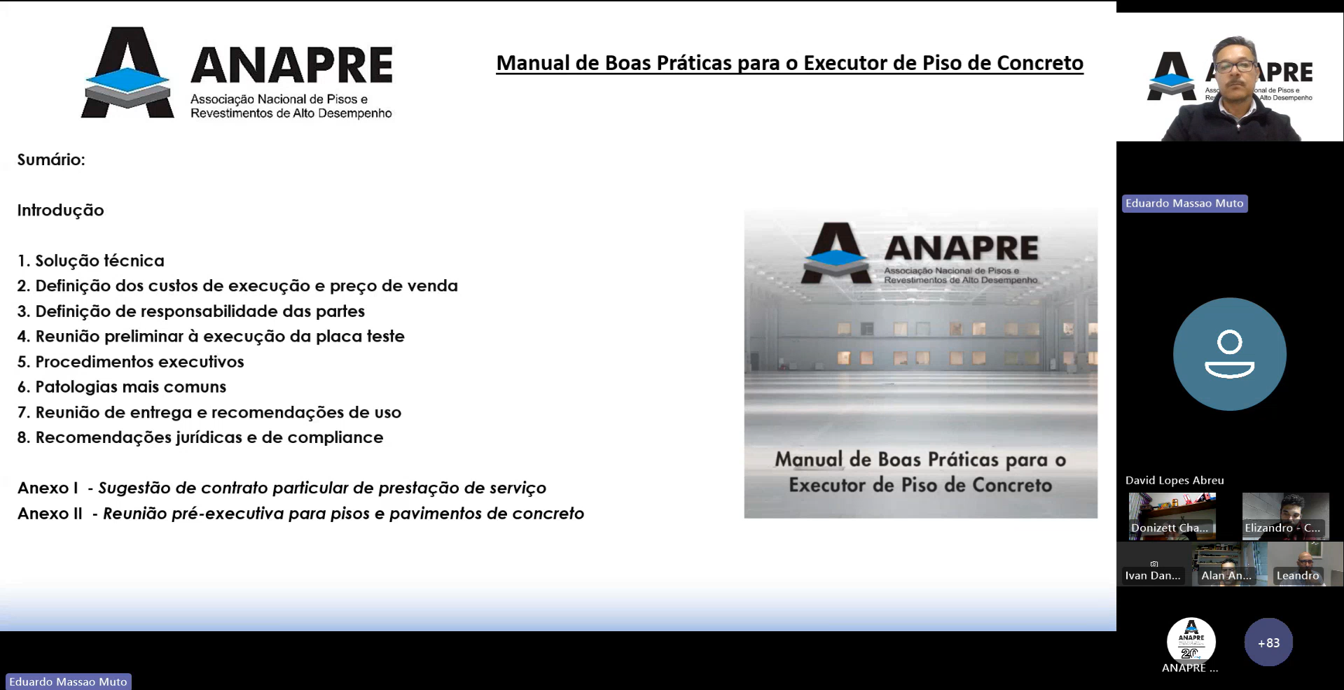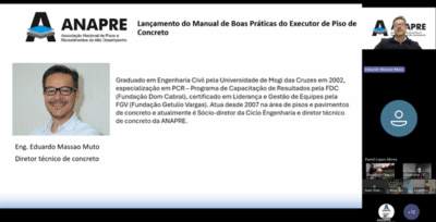 O 34º Webinar ANAPRE, realizado em 25 de setembro de 2025, foi um sucesso, contando com mais de 100 participantes em torno do tema apresentado pelo eng. Eduardo Massao Muto (diretor técnico de Concreto da Associação): o Manual de Boas Práticas para o Executor de Piso de Concreto.