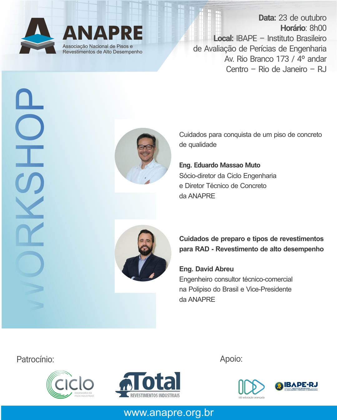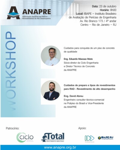 O tradicional workshop promovido pela ANAPRE sobre pisos e revestimentos de alto desempenho chega, em 23 de outubro de 2025 à capital carioca significando uma excelente oportunidade para os profissionais da área de pisos industriais e de RAD aprimorarem seus conhecimentos.